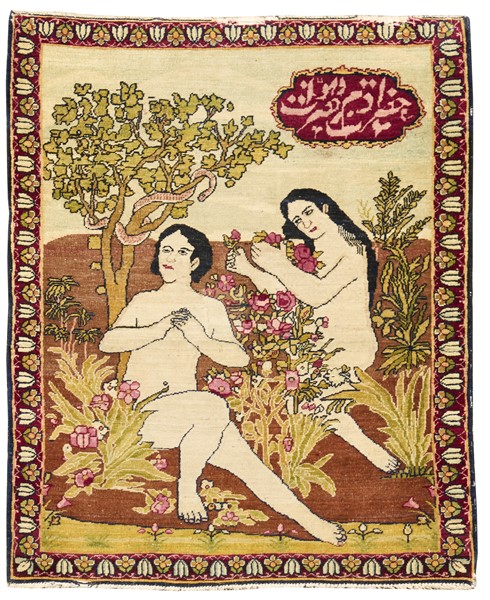Tappeto figurato Kirman, Persia, fine secolo XIX. Decoro con Adamo ed Eva nel G