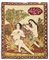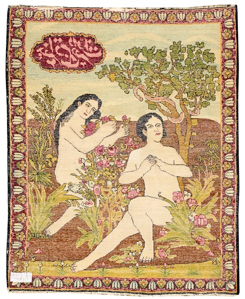 Figured carpet Kirman, Persia, late 19th century. Decoration with Adam and Eve in the Garden of Eden and a cartouche on the top with inscriptions in ancient Arabic (cm 90x73) (defects)