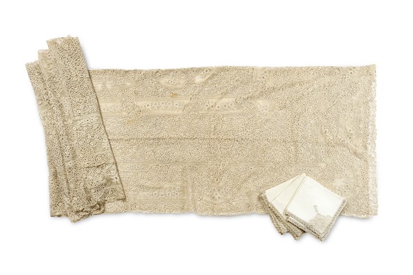 Tovaglia realizzata interamente in pizzo di Cantù in cotone colore ecrù con decoro a volute e inserti in tulle (cm 332x158) corredata di dodici tovaglioli con pizzo e cifre CF ad un angolo (difetti)