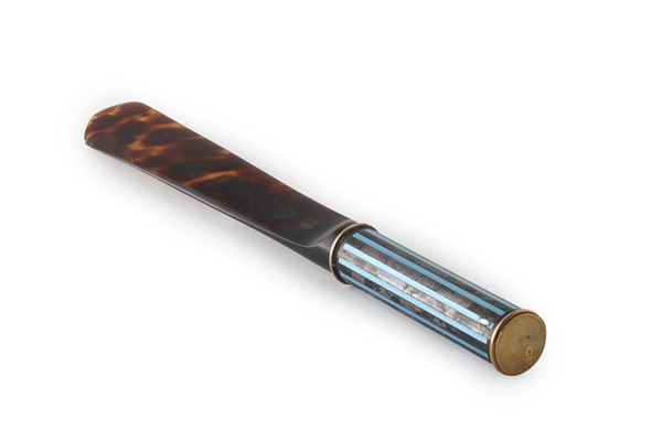 Arte del secolo XIX. Tagliacarte in tartaruga con impugnatura in argento, smalt