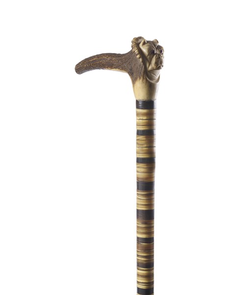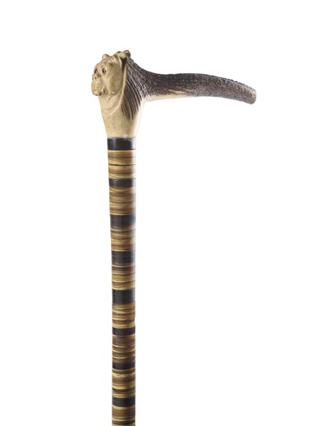 Arte del secolo XIX. Bastone da passeggio composto da dischi di corno e presa in corno scolpito con volto di cane, occhi in pasta vitrea (h. cm 94) (difetti)