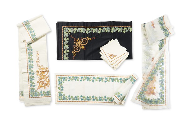 Set da tavola composto da: tovaglia lunga (cm 315x191) ventiquattro tovaglioli, una striscia da tavola, un sotto tulle in rasatello di cotone nero, ricamati con tralci di edera, rami fioriti e volute nei toni del giallo, arancio e ruggine, arricchiti da fili di lurex (difetti)