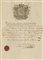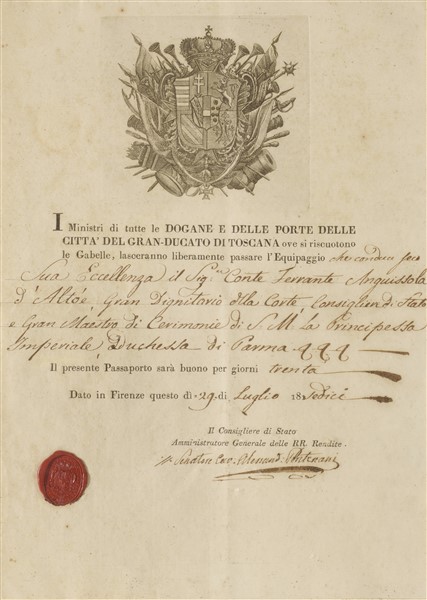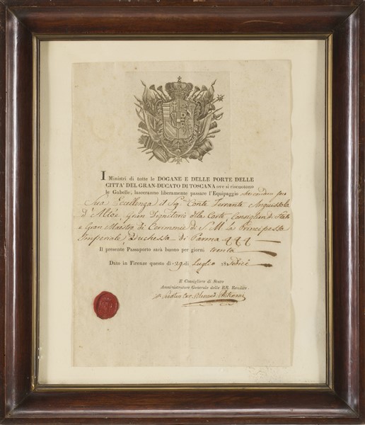 Grida del Granducato di Toscana del 29 luglio 1816 relativa alla concessione dei ministri delle Dogane e delle porte della Città del Granducato dove si riscuotono le gabelle in favore di Sua Eccellenza il conte Ferrante Anguissola d'Altoè ed il suo equipaggio con sigillo in ceralacca (cm 35x26) In cornice (difetti)