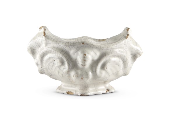 Manufacture of Faenza. White majolica salt cellar, on the long sides there are half-bust harpies with spread wings (L. cm 18) (defects and losses)