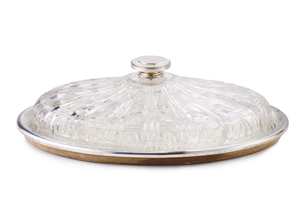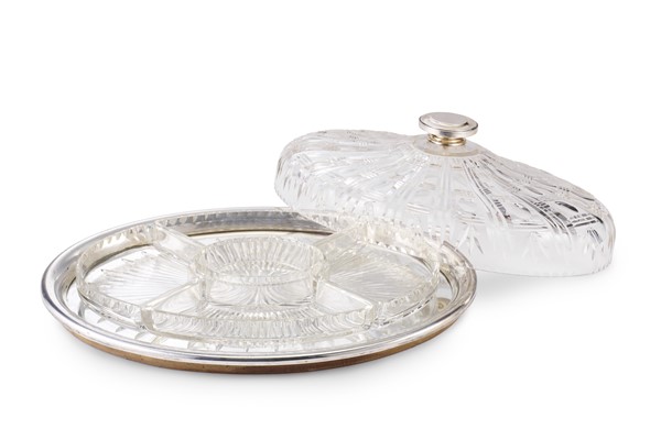 Antipastiera di forma ovale con struttura in legno rivestito in argento, campana e vaschette sagomate in cristallo molato, presa del coperchio rivestito in argento (L. cm 46) (difetti)