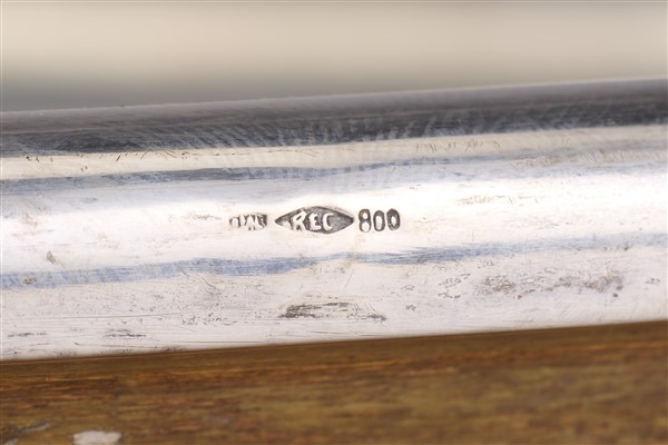 Antipastiera di forma ovale con struttura in legno rivestito in argento, campan