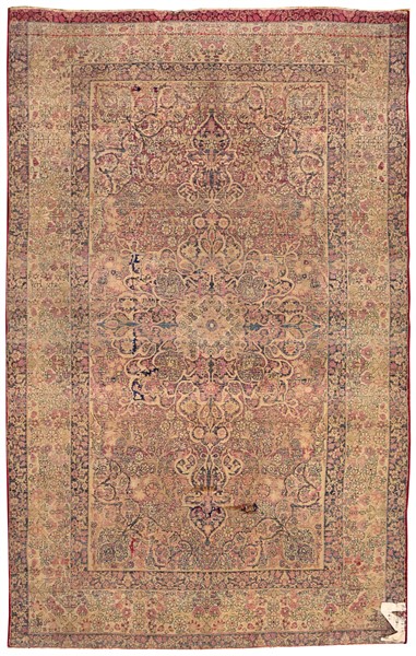Tappeto Kirman, Persia, fine secolo XIX. Decoro con medaglione floreale su fondo ciclamino (cm 203x129) (difetti e rapature)