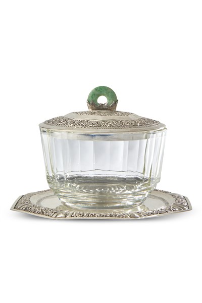 Ciotola con vassoietto e coperchio in argento traforato e inciso a volute e fiori, presa in giadeite (g lordi 230) con vasca in cristallo (difetti)