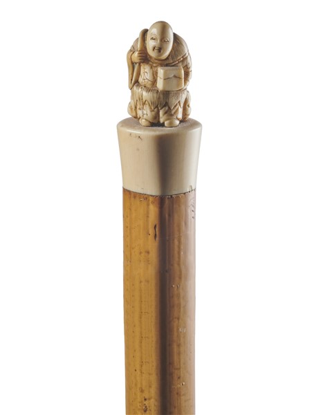Oriental art of the 19th century. Walking stick with ivory handle topped by netsuke katabori (h. cm 86) (defects)