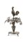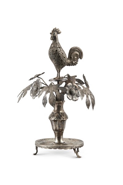 Incense holder in the shape of a rooster all round with stem in the shape of a vase with leaves and flowers. Circular base engraved with scrolls leaves, moved feet. South America, early 20th century (g 300) (h. cm 22) (minor defects)