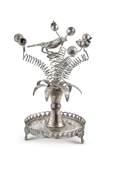 Silver incense holder in the shape of a tree with berries and birds supported by springs, circular base with perforated railings and engraved with stylized motifs. South America, 19th century (g 350) (h. cm 20 ca) (defects)
