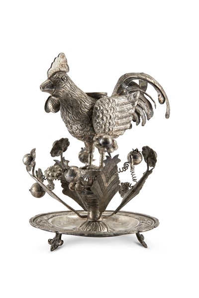 Lot 418 | Porta mate in argento a guisa di gallo con ali apribili, base circolare decorat