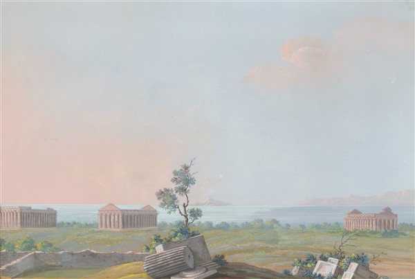 Scuola napoletana del secolo XIX "Templi di Paestum" gouache su carta (cm 27