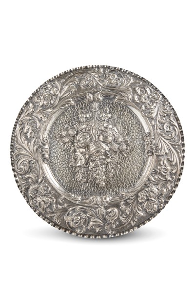 Piatto da parete in argento sbalzato con tesa decorata da volute fogliacee, fru