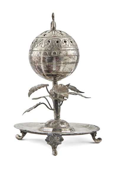 Incensiere in argento a forma di sfera traforata e incisa a motivi stilizzati e