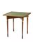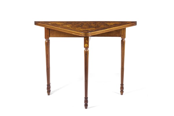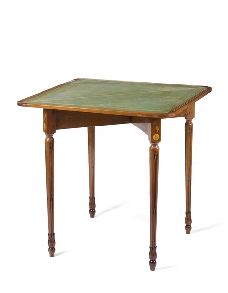 Tavolo da gioco lastronato, filettato e intarsiato a cornucopie, fiori e volute fogliate in legni di varie essenze, piano apribile in pelle verde impressa in oro, gambe scanalate. Olanda, secolo XIX (aperto cm 76x73x76) (difetti)