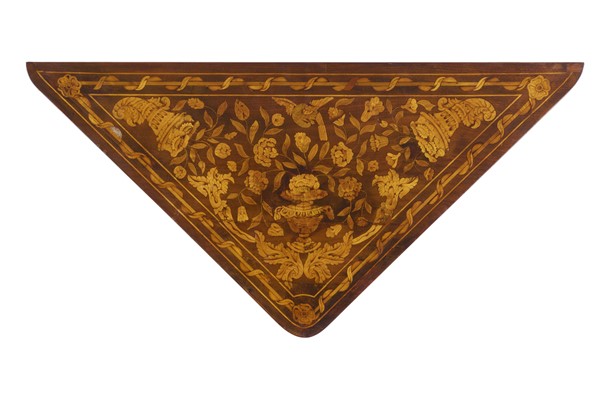 Tavolo da gioco lastronato, filettato e intarsiato a cornucopie, fiori e volute