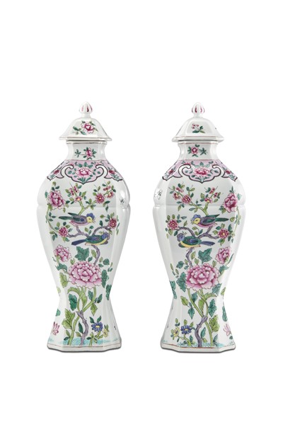 Manufacture of Samson, 19th century. Pair of oriental potiches with porcelain lid decorated in polychrome floral motifs of the Rosa family (h. cm 38) (minor defects)