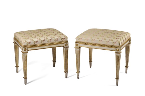 Coppia di sgabelli in legno dipinto e dorato, bordo perlinato, gambe rastremate a obelisco rovesciato. Napoli, secolo XVIII (restauri)