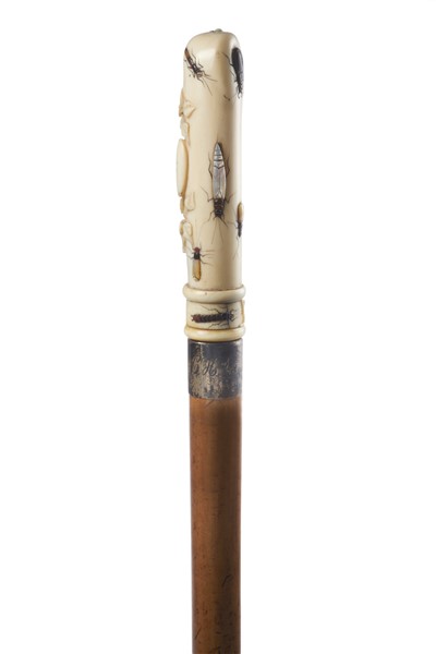 Arte del secolo XIX. Bastone da passeggio con presa Shibayama in avorio inciso, decorato e intarsiato a insetti in madreperla e materiali diversi, ghiera in argento inglese, fusto in malacca, puntale in corno (h. cm 84) (difetti)