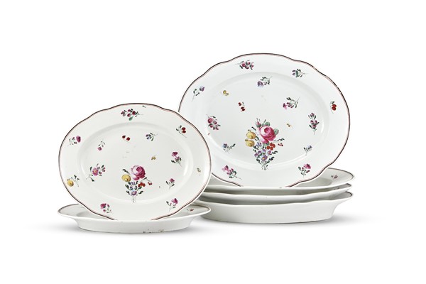 Manifattura Ginori, Doccia, fine secolo XVIII. Lotto composto da quattro vassoi e due più piccoli ovali a profilo polilobato in porcellana dipinta in policromia "al mazzetto" e fiori sparsi, bordura in rosso e nero (cm max 37,5x29,5) (difetti)