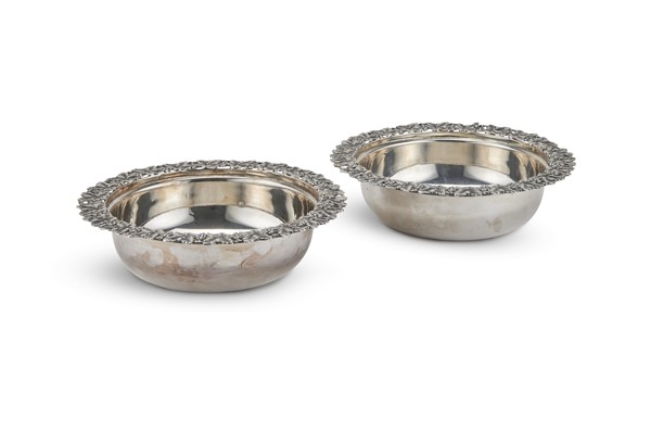 Coppia di ciotole in argento con bordo traforato a tralci di viti e uva. Milano