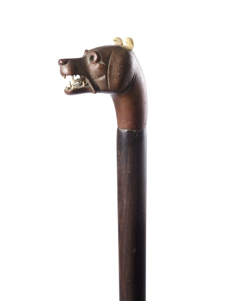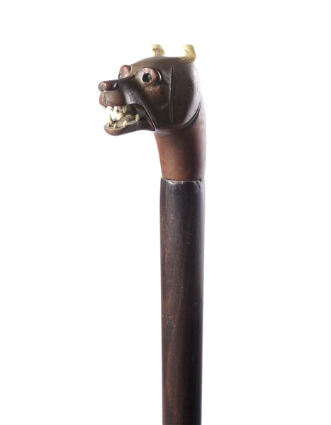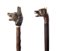 Arte della Foresta Nera, secolo XIX - XX. Lotto composto da due bastoni da passeggio con fusti rispettivamente in legno spinato ed ebanizzato, prese scolpite in forma di teste di felini con dettagli in osso (h. max cm 93) (difetti)