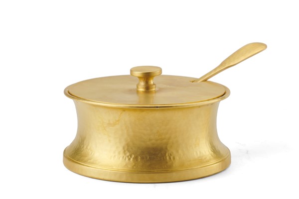 Zuccheriera con coperchio e cucchiaio in argento vermeil martellato. Firenze, a