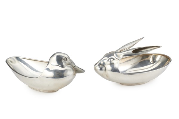 Due ciotole in argento in forma di anatra e coniglio. Milano (g 600) (L. max cm