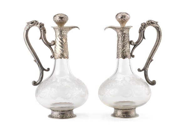 Coppia di caraffe in cristallo inciso con decoro a volute, ghiere, presa e tappo in argento sbalzato a motivi vegetali. Secolo XIX (h. cm 28) (lievi difetti)