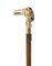 Arte del secolo XIX. Bastone da passeggio con presa Shibayama sagomata a "L" in avorio decorato e intarsiato a insetti in madreperla e materiali diversi, ghiera in metallo argentato e dorato con cane a rilievo entro cartiglio (h. cm 82) (difetti)