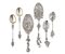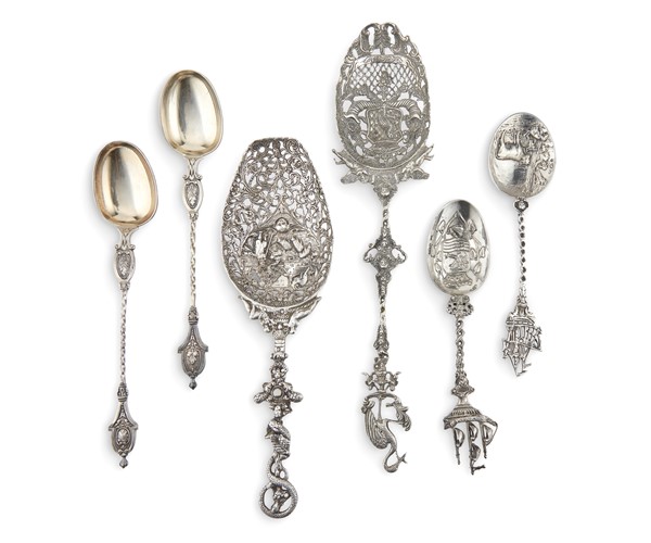 Sei posate in argento riccamente inciso e traforato, prese a velieri, animali e