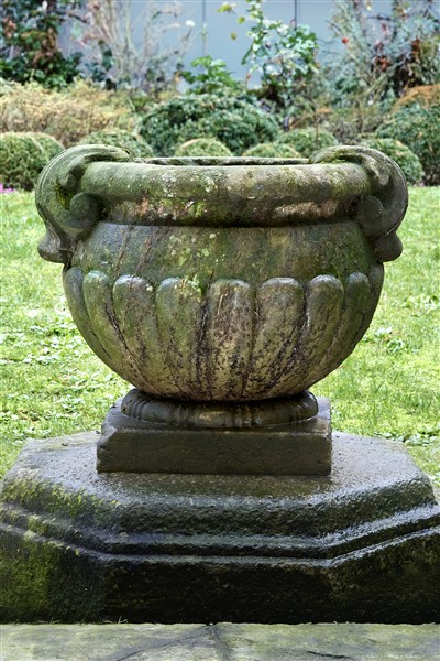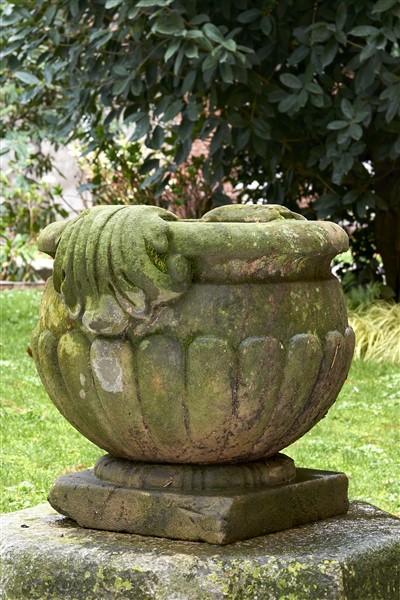 Vaso biansato in pietra a corpo baccellato con anse a volute fogliate. Secolo XIX (cm 61x42x52) (difetti)