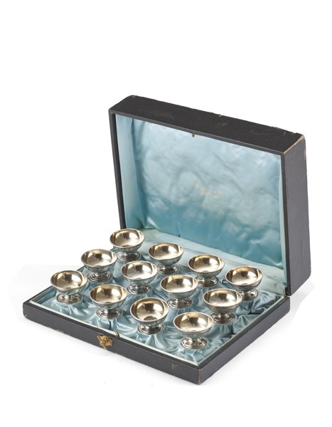 Lot 511 | Gruppo di dodici piccoli portauovo in argento sterling con interno in vermeil.