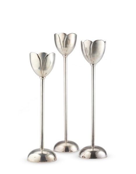Lot 515 | Gruppo di tre candelieri in argento in forma di tulipani. Como, argentiere Ronc