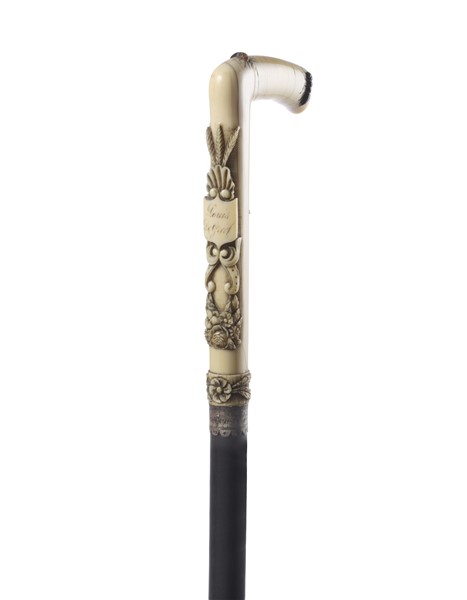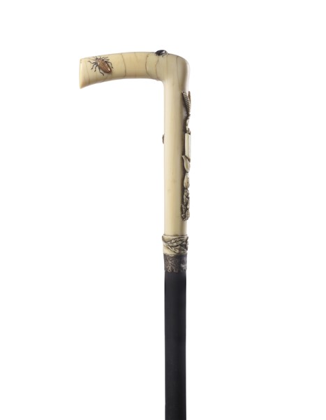 Arte secolo XIX. Lotto composto da tre bastoni da passeggio con prese in avorio scolpito, fusti di forme e legni differenti (h. max cm 91) (difetti e rotture)