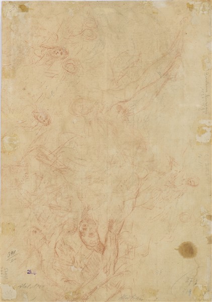 On the recto "Saint Jerome listening to the trumpet" in watercoloured pen and brown ink and on the verso "Study of figures" in sanguine