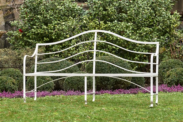 Divano in ferro verniciato bianco con bordure scanalate, piedi ferini (cm 205x1