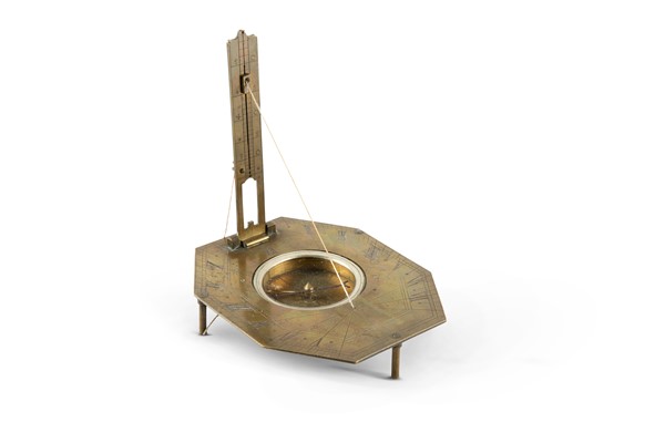Orologio solare portatile in ottone di forma ottagonale. Nel lato superiore son