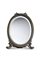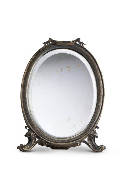 Specchiera ovale da tavolo con cornice in argento sormontata da nastro inciso "Ex forti dulcedo", fascia interna martellata, piedi a ricciolo e foglie d'acanto. Milano, argentiere A. Giacchè (h. cm 45) (difetti)
