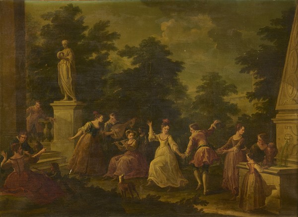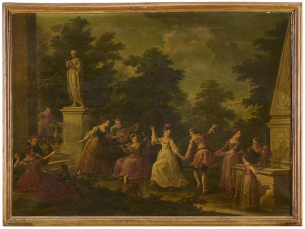 Scuola del secolo XVIII "Ballo in giardino" olio su tela (cm 83,5x113) in corn