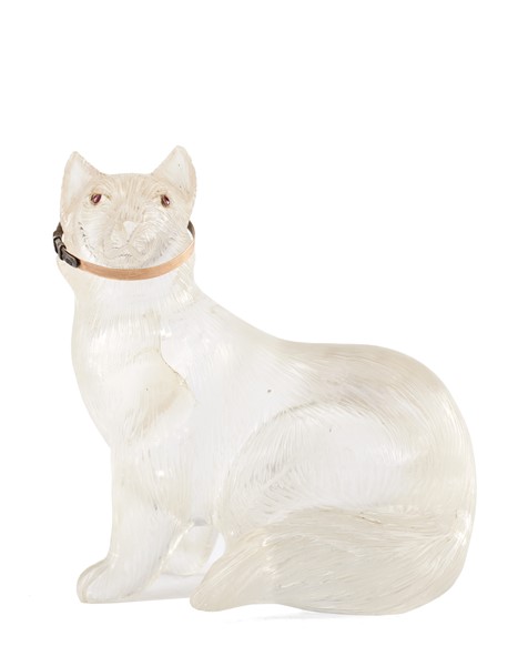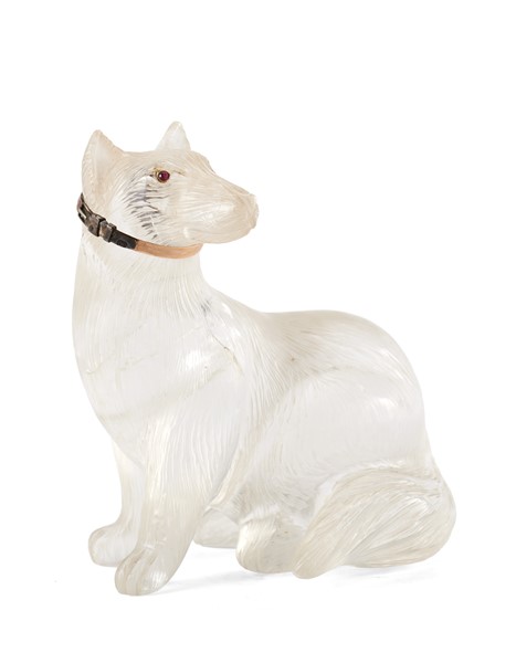 Arte russa, fine secolo XIX/inizio secolo XX. Scultura raffigurante volpe in cristallo di rocca e collare in oro, occhi in pietre dure (cm 13x13) (difetti)