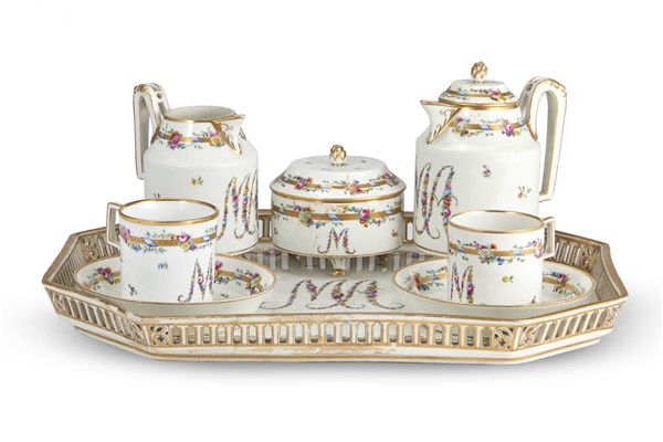 Manifattura di Vienna, fine secolo XVIII. Servizio tete a tete in porcellana dipinta in policromia e ghirlande fiorite con monogramma "M" "A" e profili in oro composto da: caffettiera, lattiera, zuccheriera, due tazzine con piattino e vassoio ottagonale con bordo traforato, una tazzina del secolo XIX (cm vassoio 38x29) (difetti, mancanze e restauri)