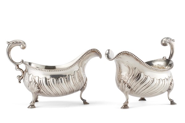 Coppia di salsiere in argento con corpo baccellato e profilo perlinato, sostegno tripode in forma di zoccolo. Punzoni di Londra di difficile lettura (g 800) (cm 21x12) (lievi difetti)