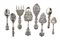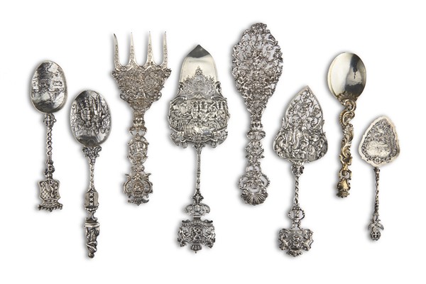 Lotto composto da otto posate in argento riccamente inciso,traforato e decorato a figure e paesaggi. Prese a stemmi araldici. Secolo XIX - XX (g 600) (L. max cm 28)(difetti)