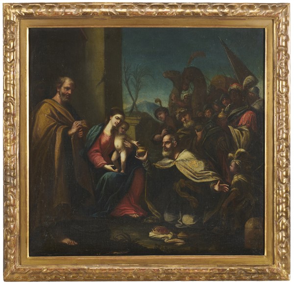 Scuola lombarda del secolo XVIII "Adorazione dei magi" olio su tela (cm 69x79)