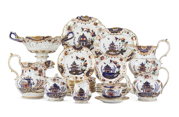 Manifattura di Davenport, secolo XIX. Servizio da dessert in porcellana profilata in oro e decorata in policromia composto da: sei tazze da tè con piatto, dodici piatti da burro, dodici piatti da dolce, due vassoietti, due piatti da portata, teiera con coperchio, zuccheriera con coperchio, lattiera,due brocche e tre alzate (lievi difetti)
