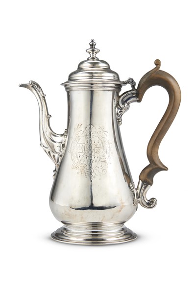 Caffettiera in argento liscio con corpo inciso a stemma araldico, presa del coperchio a trottola, ansa a voluta in legno, base circolare gradinata. Londra, 1764. Punzone dell'argentiere parzialmente abraso (h. cm 25) (g lordi 800) (lievi difetti)