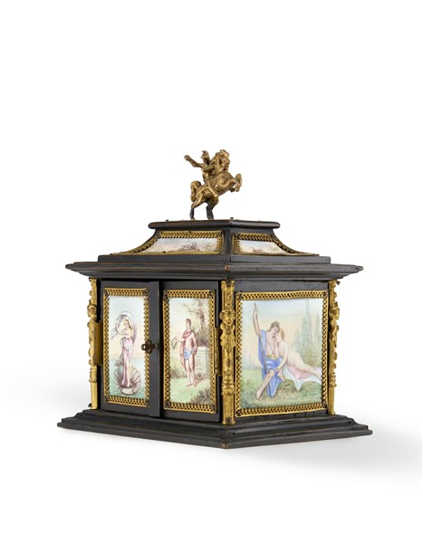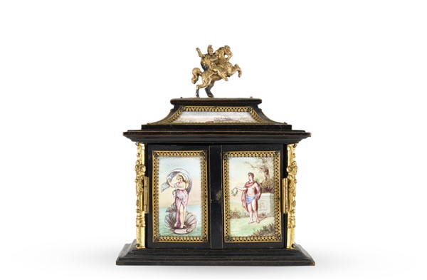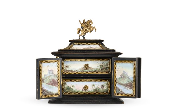 Cofanetto in legno ebanizzato interamente decorato da placche in smalto policromo a figure mitologiche e paesaggi, all'interno due tiretti, sormontato da armigero su cavallo rampante in metallo (cm 11x13x9) (lievi difetti)