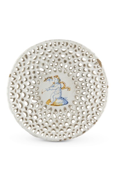 Manufacture of Faenza, late 16th century. Perforated Crespina in white majolica decorated in polychrome in the style of putto with cornucopia in the cable (d. 27 cm) (defects)